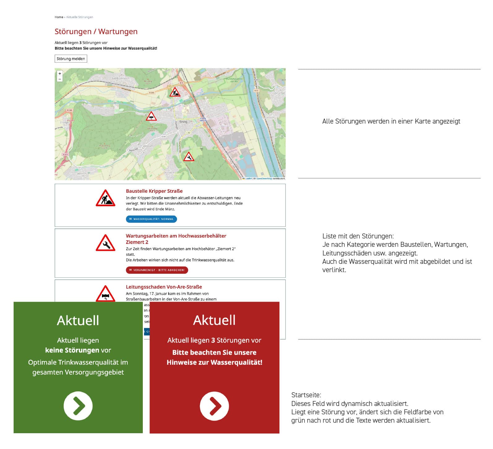 Darunter eine Liste mit den Störungen und der Wasserqualität, wenn z.B. bei der Wartung eines Hochbehälters der Chloranteil erhöht werden muss.