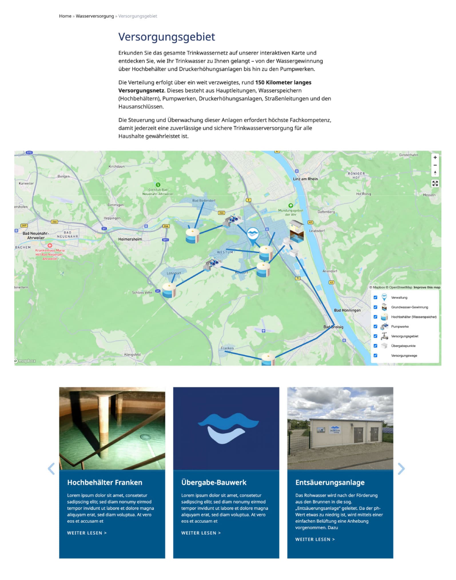 Für die Darstellung des Versorgungsgebiets wurde eine interaktive Karte gewünscht. Das eingesetzte Kartenmodul ermöglicht es, Marker, Linien und Flächen (Polygone) als Layer auf Google Maps oder OpenStreetMap zu platzieren – inklusive der Möglichkeit, individuelle Bilder anstelle klassischer Marker zu verwenden.